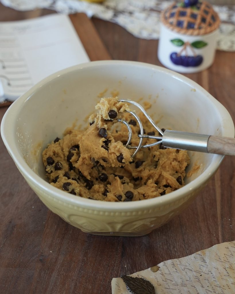- Fold in the flour, cornstarch, baking soda, salt, and the chocolate chips.