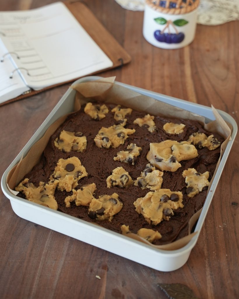 - And finally, dollop the second half of your cookie dough on top of your brownie batter
