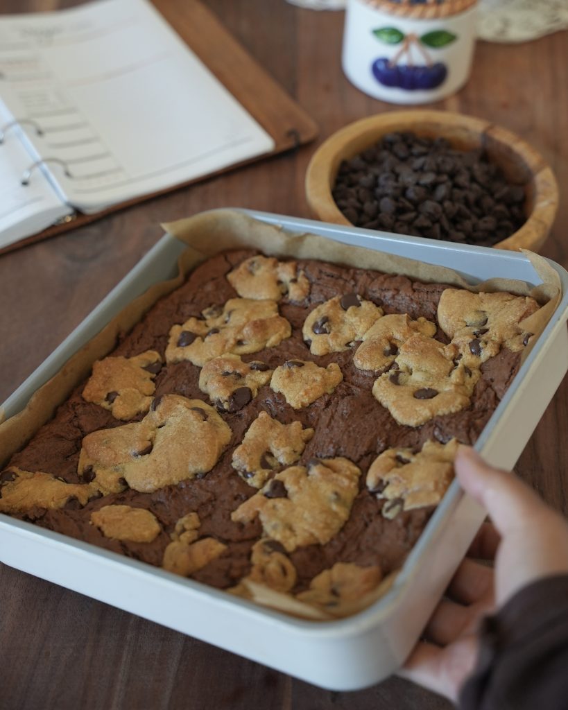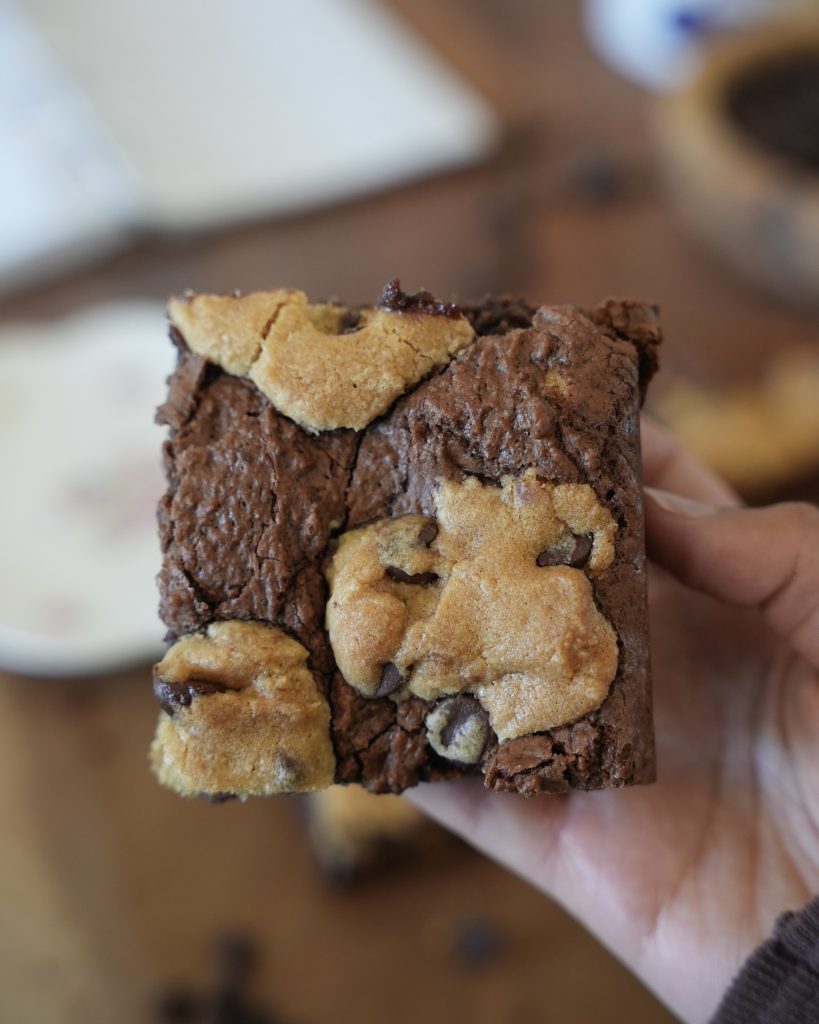 A fudgy, crackly-topped brownie with brown butter, and a chocolate chip cookie batter baked right on top and layered through the middle ᝰ.ᐟ