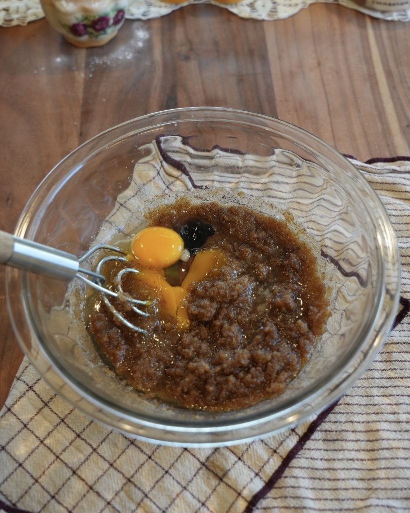 - Measure both sugars into a medium bowl. Once the brown butter has cooled slightly, add it to the bowl and mix until combined.