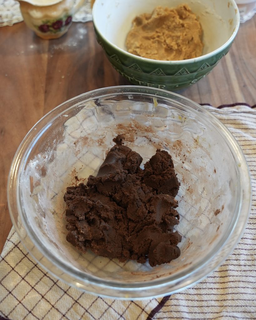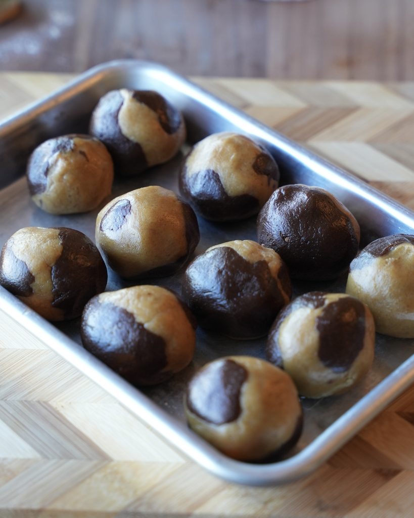 - Shape the cookies by scooping out 30-gram portions of dough. For a subtle marbled effect, alternate the two doughs in each cookie, or for an easier method, simply press half of each dough together. Arrange the cookies on a lined baking sheet, leaving some space between each