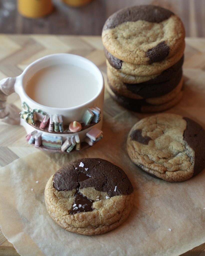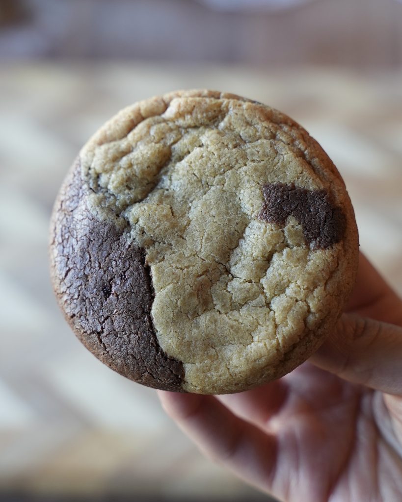 Chocolate-chipless brown butter dough marbled with espresso brownie cookie dough