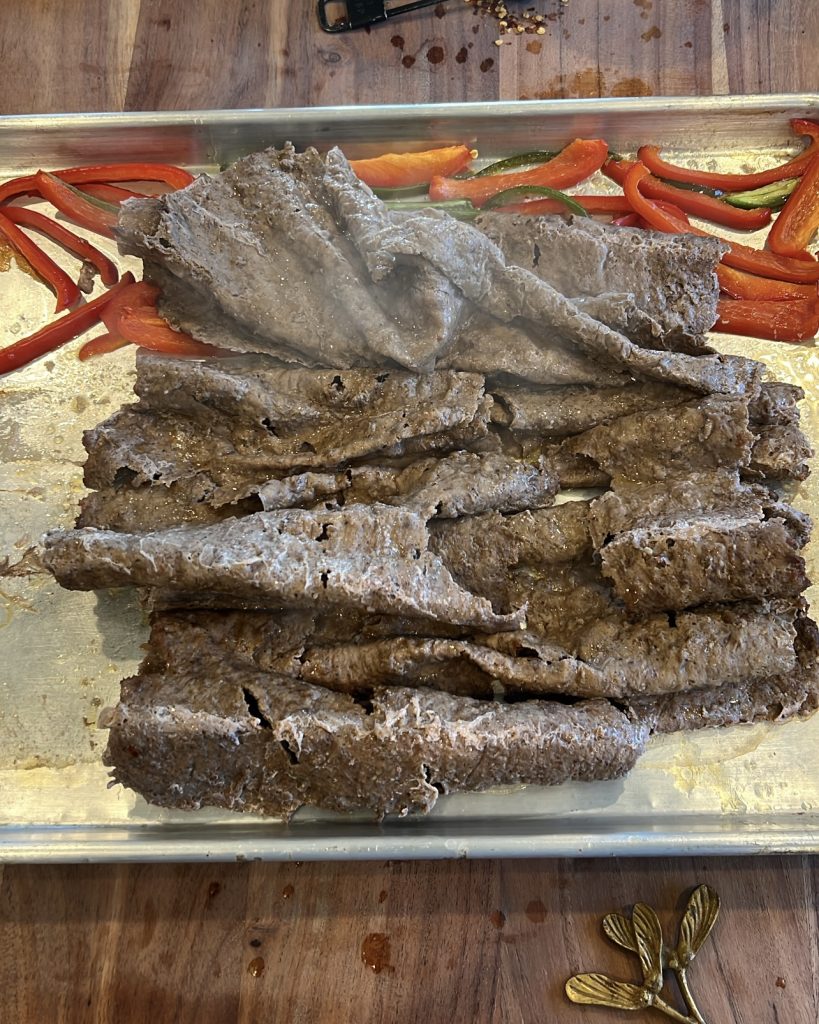 - Roll the entire sheet up tightly, transfer the roll to a sheet pan, and bake at 400°F for 20 minutes. If you have any veggies you’d love in your sandwich (like peppers, jalapenos, or tomatoes) toss them on the pan to roast alongside the beef for extra flavor.