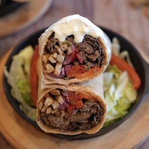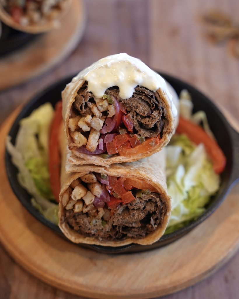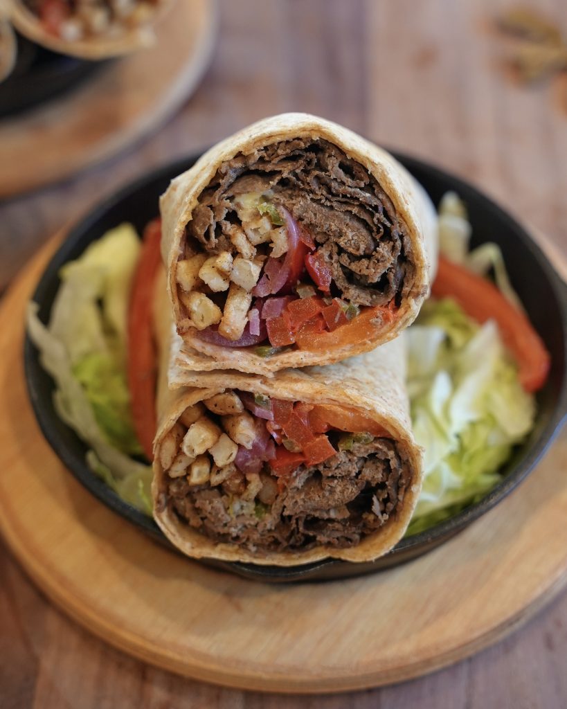 Thin sheets of seasoned beef that get layered into warm lavash with all the happy add-ins; pickled red onions, French fries, grilled peppers, and jalapeños. All together, it makes the most delicious doner kebab-style sandwich