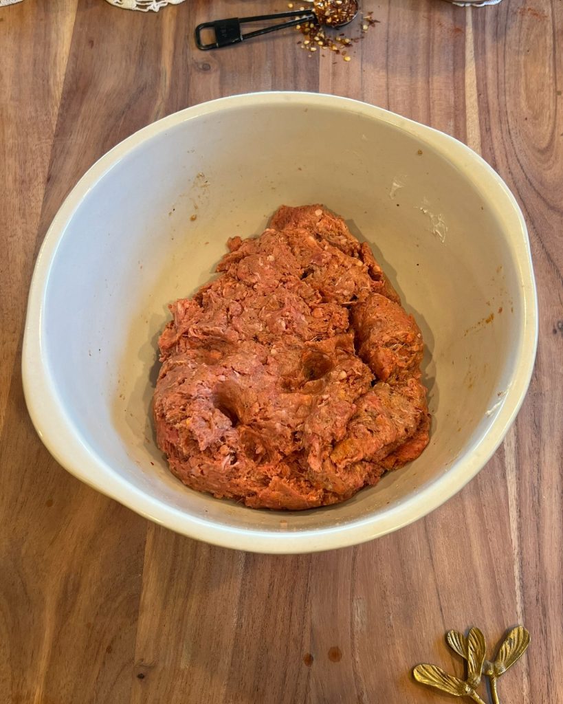 - Add the ground beef, lamb, grated onion, grated garlic, yogurt, pomegranate molasses, olive oil, paprika, sumac, cumin, coriander, salt, black pepper, garlic powder, onion powder, and chili flakes to a mixing bowl. Work it together with your hands until it looks smooth and evenly seasoned