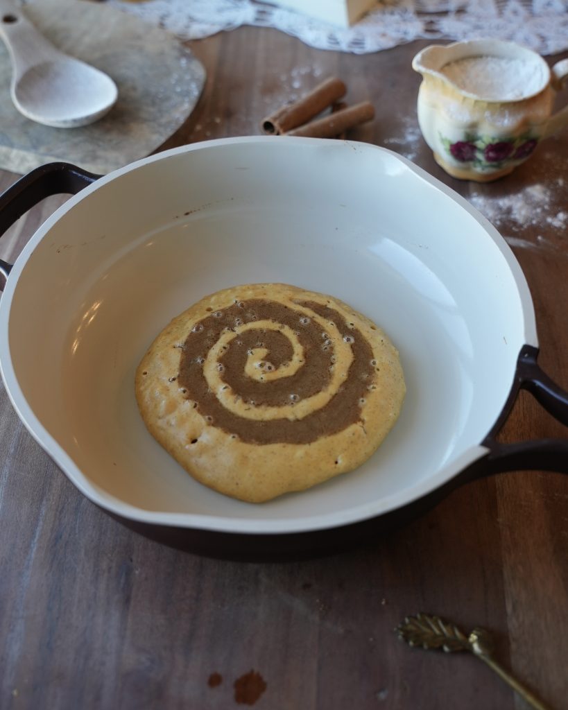 - Pipe a slightly thicker swirl so that once the pancakes are cooked, the ‘cinnamon roll’ effect is pronounced and really stands out, compared to how a thin swirl would look