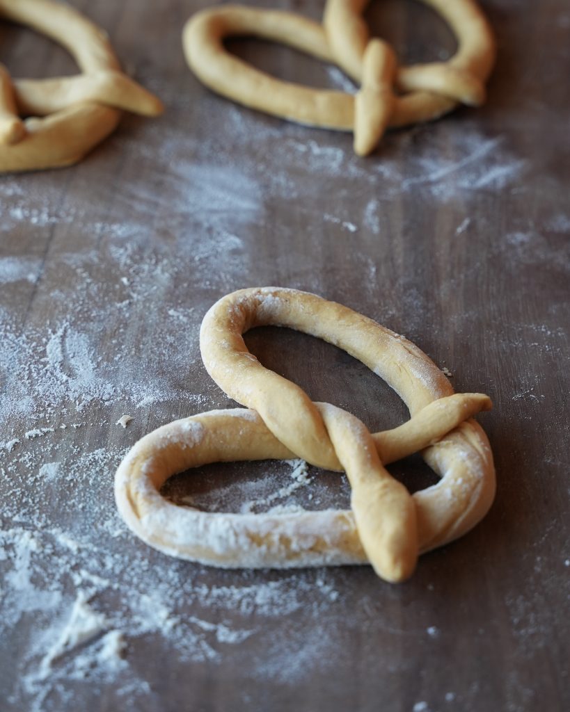 - To prevent your pretzels from unraveling: when you twist the rope into a pretzel, press the ends into the bottom loop firmly (give it a little pinch as well) , almost like you’re “gluing” them in with gentle pressure. You can even dab a bit of water on the spots where the dough overlaps