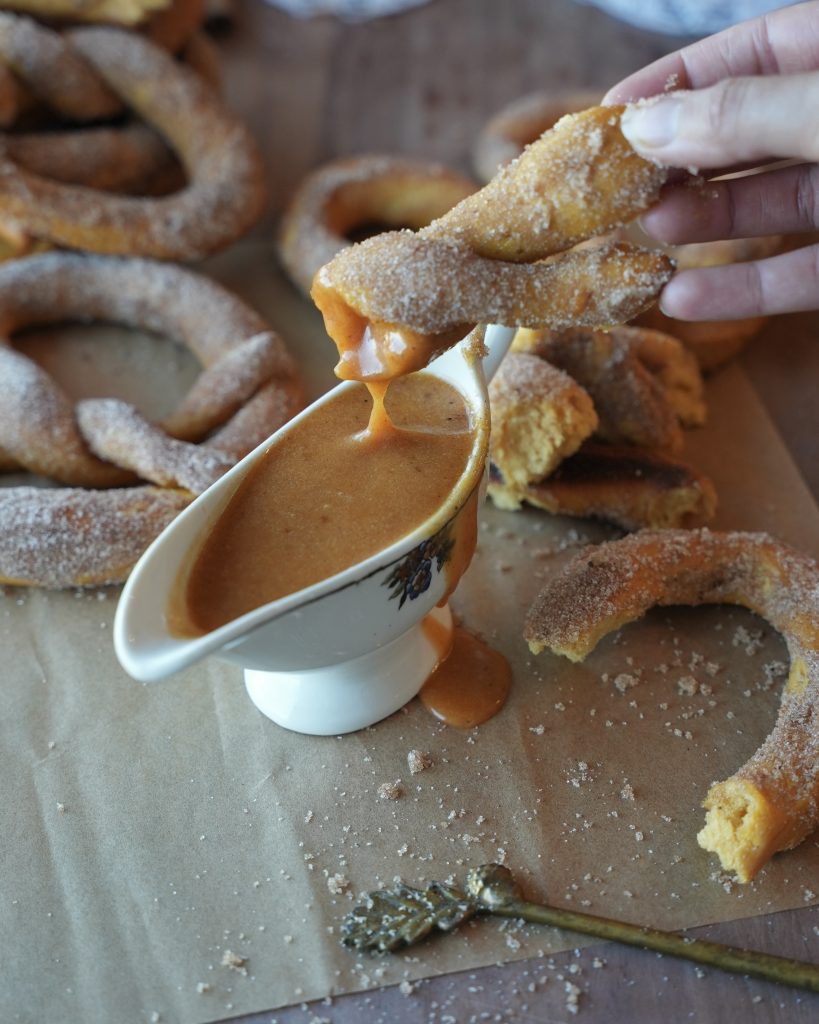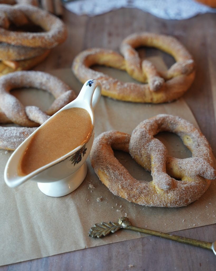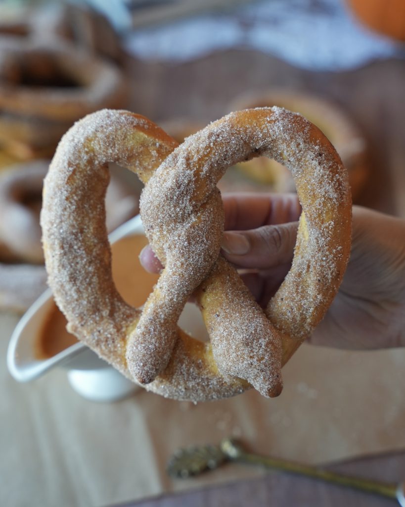 Pumpkin pretzels coated in salted butter and pumpkin spice sugar, dipped in a pumpkin vanilla glaze.