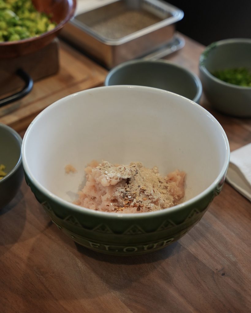 - Place the chopped napa cabbage in a bowl, sprinkle with ½ tsp salt and massage it together. let sit for 10–15 minutes. Squeeze out as much liquid as possible, then transfer to a clean bowl. Add the ground chicken, cilantro, soy sauce, oyster sauce, sesame oil, ginger, garlic, scallions, rice vinegar, cornstarch, white pepper, and chili flakes if using. Mix until cohesive and slightly sticky, then refrigerate while you prepare the rest of our dish