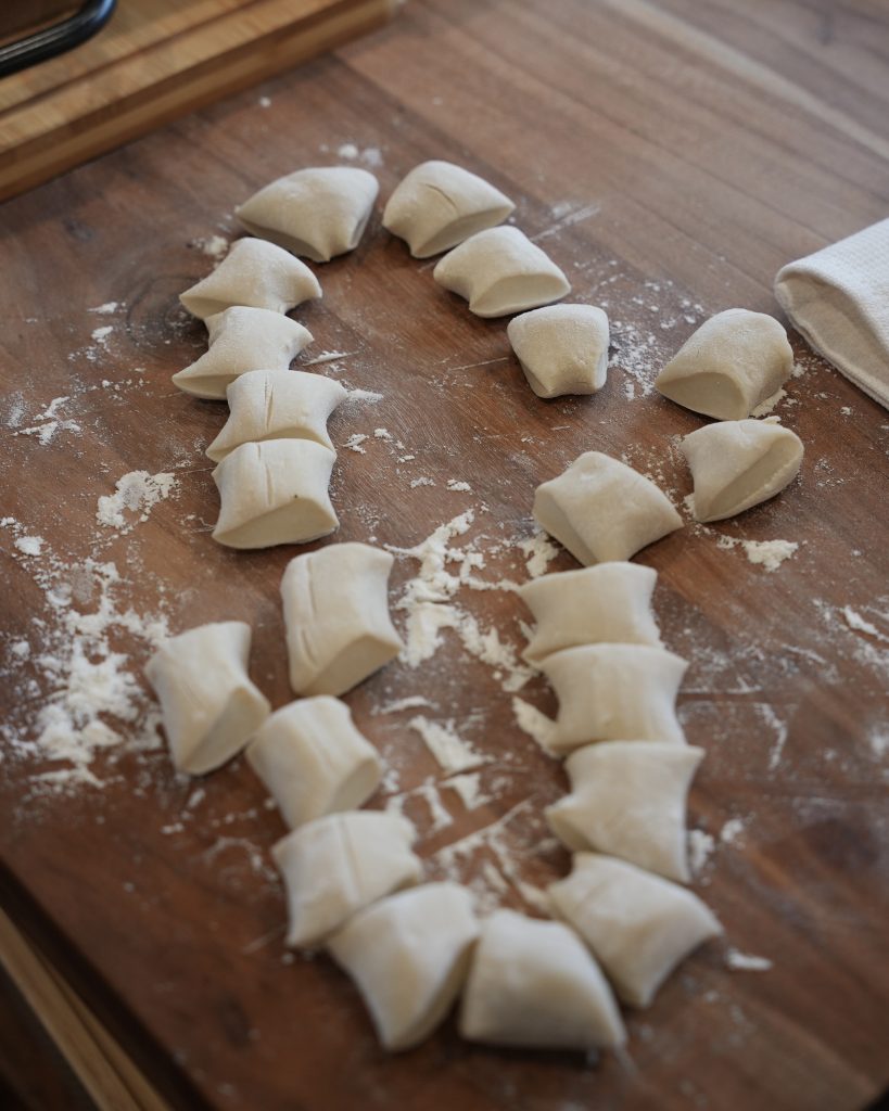 - Gently poke a hole in the middle of your dough. Flour your hands and gently stretch out your dough into a long oval bagel shape. Divide the rested dough into 20 g pieces with a bench scraper. Roll or pat each into a 3-inch round (refer to tip section) . Do not stack the wrappers, they will stick. Either work one at a time by rolling, filling, and shaping each wrapper, or roll them all out and give each one its own space on the countertop without overlapping. This will save you a lot of frustration and keep all that hard work intact