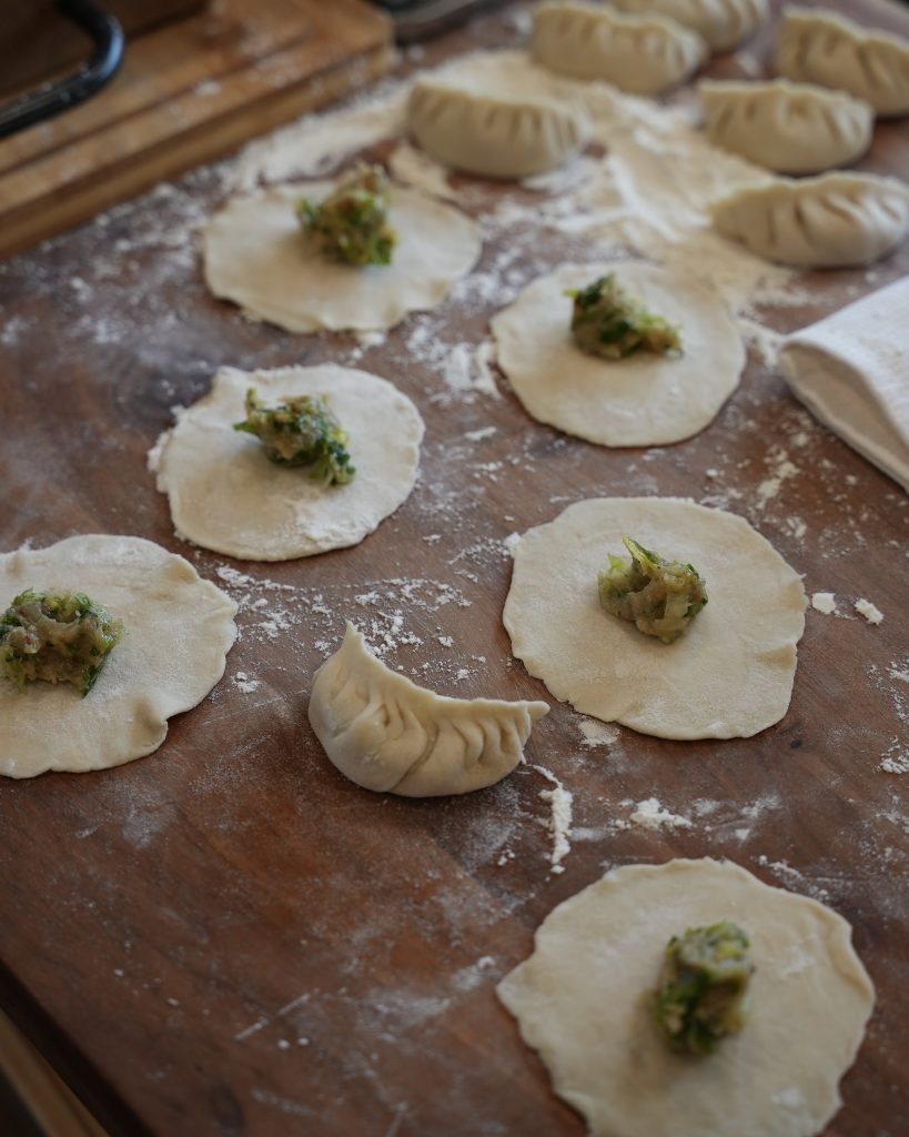 - For the dumpling wrappers, for a casual dinner at home I honestly don’t even bother with a rolling pin. I just shape them into 3-inch circles with my hands. If I were making them for guests, I’d probably be a bit more precise, but how you go about it is completely up to you.