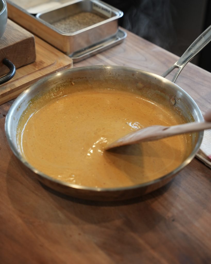 - Heat a 10 or 12 inch stainless steel saucepan over medium heat. add your butter and neutral oil, add the shallot and cook for 2–3 minutes until softened. Stir in the garlic and grated ginger, cook for 30–45 seconds until fragrant. Add the red curry paste and cook for about 2 minutes to bloom. Sprinkle in your seasonings, then pour in the 120 grams of coconut cream . Stir continuously for 2–3 minutes until emulsified. Now, add the 400 grams coconut milk, oyster sauce, soy sauce, teriyaki sauce, and brown sugar. Simmer for 10 minutes until slightly thickened, then turn off heat