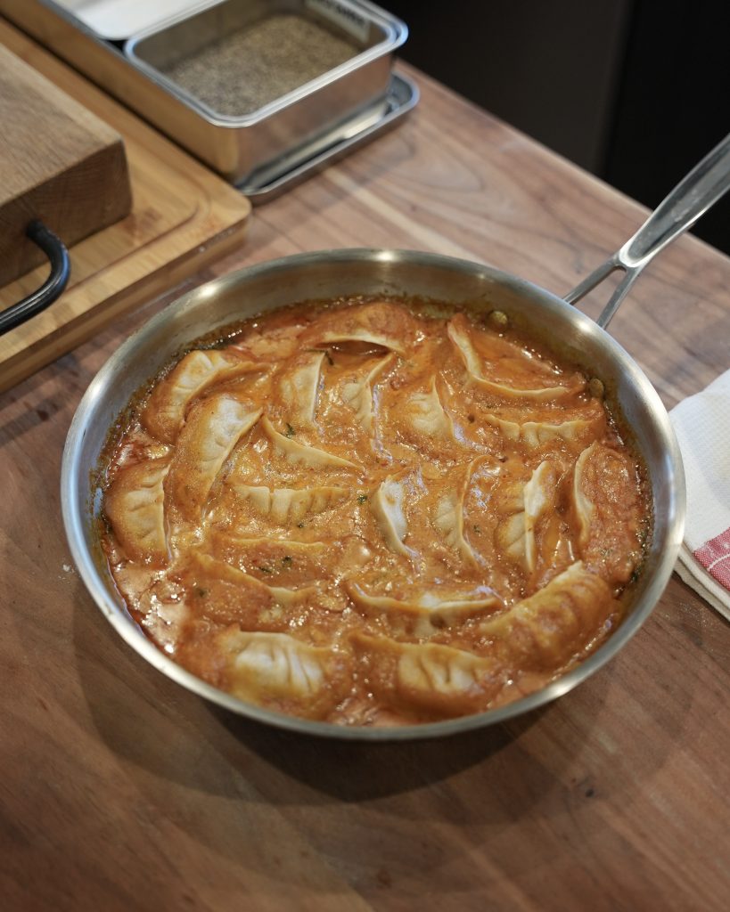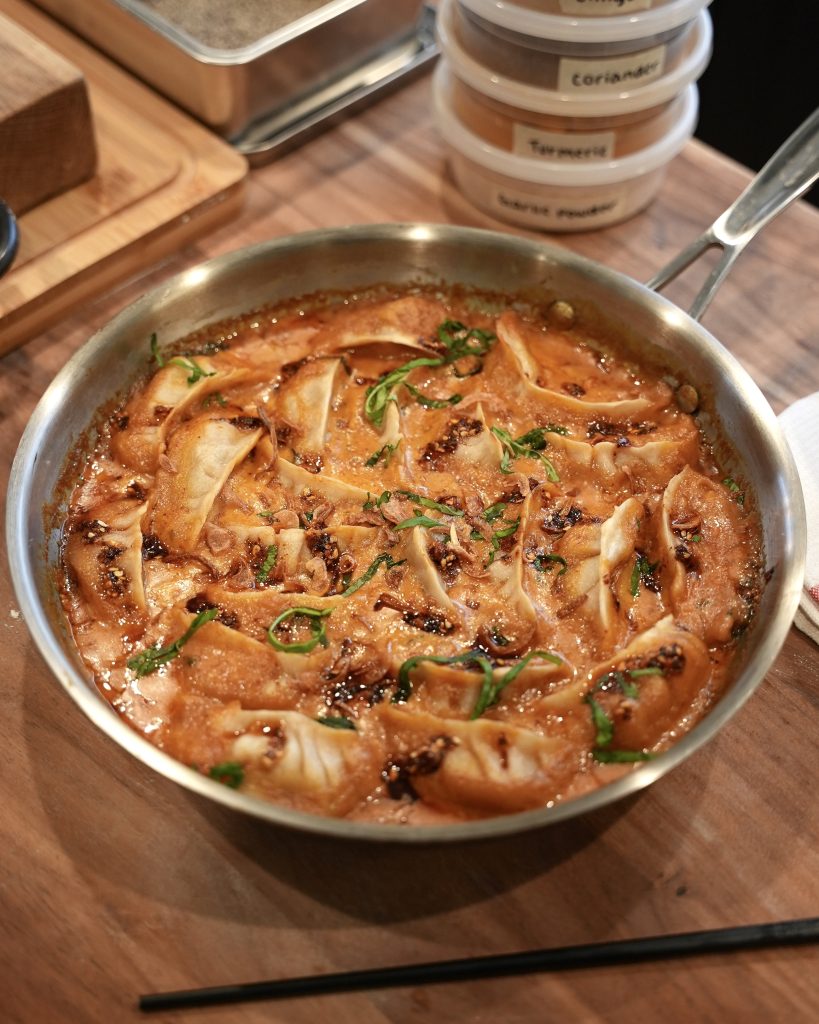 Inspired by the viral Trader Joe’s dumpling bake making the rounds on social media, today we’re making homemade dumplings baked in a rich, coconut red curry sauce