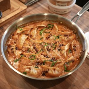 Today we’re making homemade dumplings baked in a rich coconut red curry sauce. For the last couple of months, I’ve been seeing videos everywhere of people making an easy weeknight dinner using Trader Joe’s premade chicken dumplings, a few of their sauces, and coconut milk.