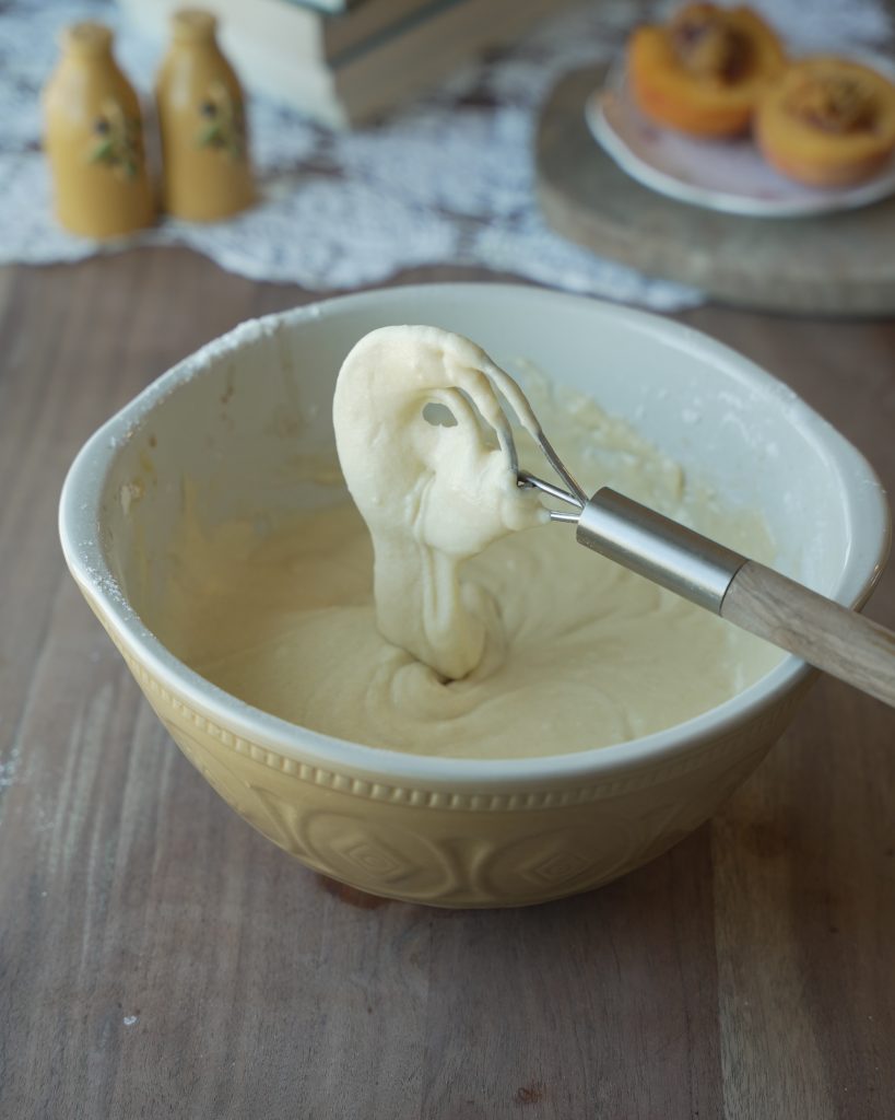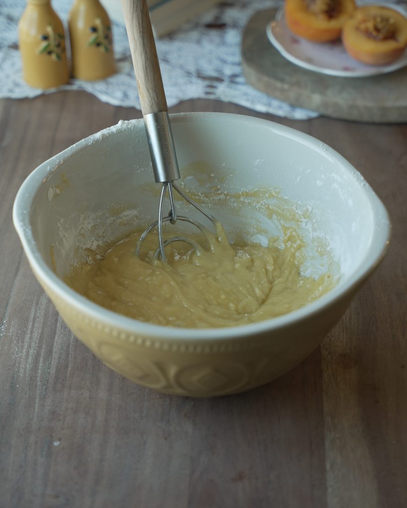 - Gently add your batter on top of your peaches and sugar mixture and smooth out the top without disturbing the peaches