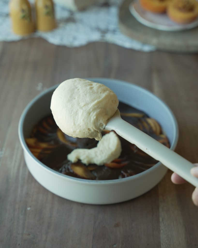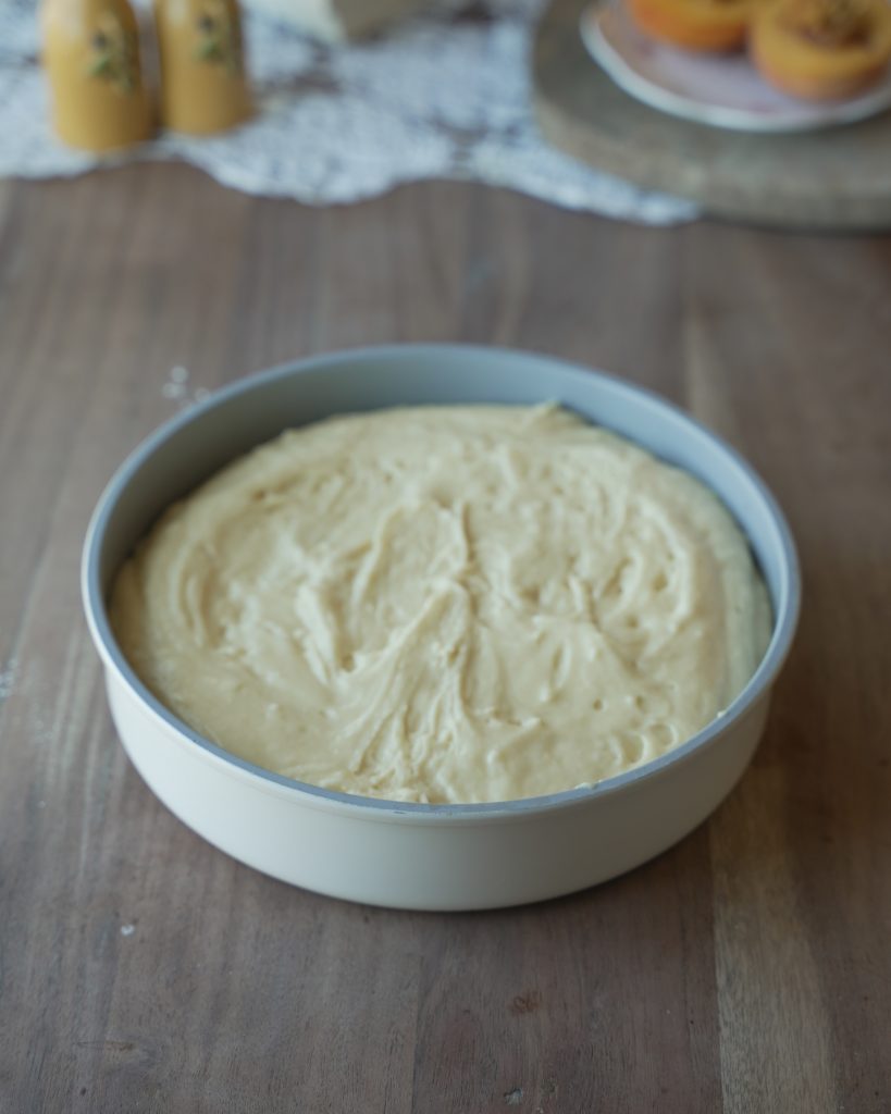 - Spread the sugar mixture, as well as the batter very gently over your peaches. We don’t want to disturb out peach layer